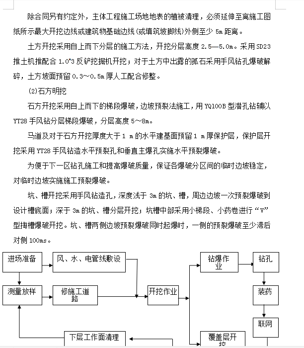 溢洪道开挖总的施工程序是:先修施工道路,然后按平面上分区,立面上从上至下分层开挖。溢洪道开挖根据进出口分段进行。边坡支护在分层开挖过程中紧跟开挖面进行,上层的支护保证下一层的开挖安全顺利进行,随机支护随开挖及时进行。