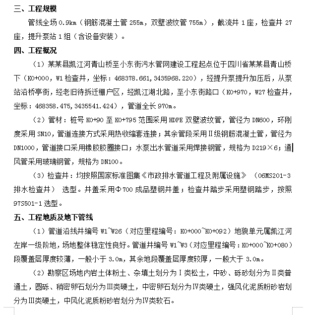 某某县凯江河青山桥至小东街污水管网建设工程起点位于四川省某某县青山桥下(K0+000,W1检查井,坐标:468378.661,3435968.220),经提升泵提升加压后,从泵站沿桥亭街,经老旧待拆迁棚户区,经凯江湖北路,至小东街路口(K0+970,W27检查井,坐标:468358.475,3435541.424),管道全长970m。