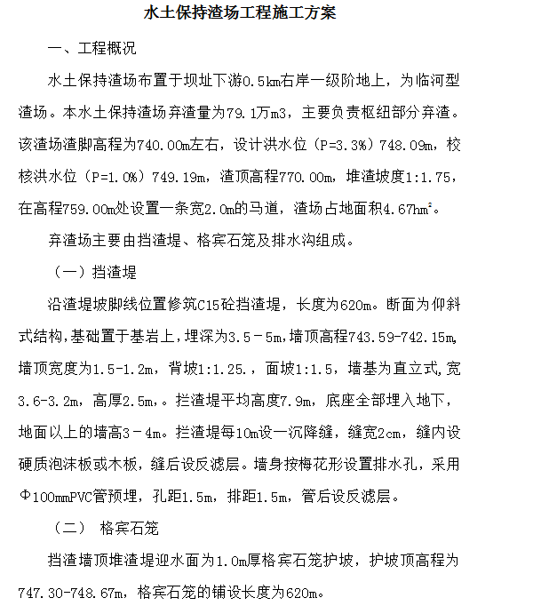 水土保持渣场布置于坝址下游0.5km右岸一级阶地上,为临河型渣场。本水土保持渣场弃渣量为79.1万m3,主要负责枢纽部分弃渣。该渣场渣脚高程为740.00m左右,设计洪水位(P=3.3%)748.09m,校核洪水位(P=1.0%)749.19m,渣顶高程770.00m,堆渣坡度1:1.75,在高程759.00m处设置一条宽2.0m的马道,渣场占地面积4.67hm2。弃渣场主要由挡渣堤、格宾石笼及排水沟组成。