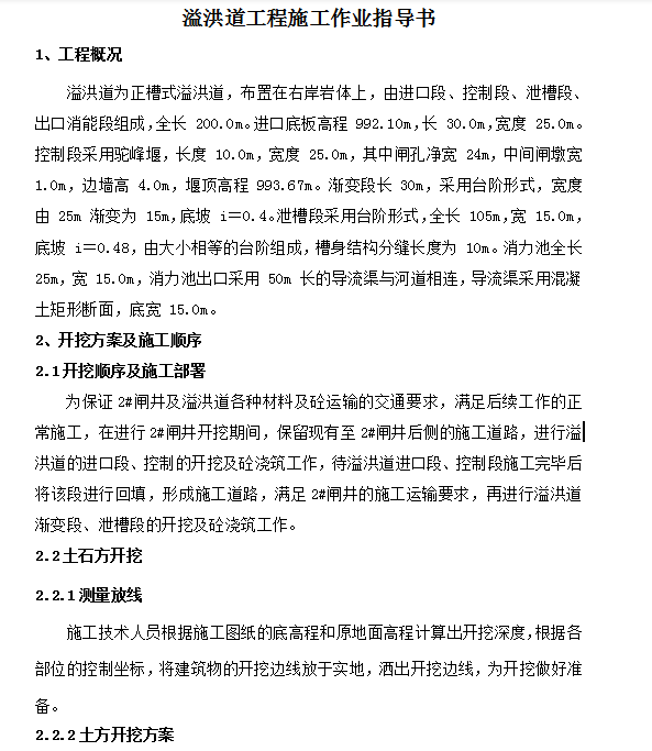 溢洪道为正槽式溢洪道,布置在右岸岩体上,由进口段、控制段、泄槽段、出口消能段组成,全长 200.0m。进口底板高程 992.10m,长 30.0m,宽度 25.0m。控制段采用驼峰堰,长度 10.0m,宽度 25.0m,其中闸孔净宽 24m,中间闸墩宽 1.0m,边墙高 4.0m,堰顶高程 993.67m。渐变段长 30m,采用台阶形式,宽度由 25m 渐变为 15m,底坡 i=0.4。泄槽段采用台阶形式,全长 105m,宽 15.0m,底坡 i=0.48,由大小相等的台阶组成,槽身结构分缝长度为 10m。消力池全长 25m,宽 15.0m,消力池出口采用 50m 长的导流渠与河道相连,导流渠采用混凝土矩形断面,底宽 15.0m。