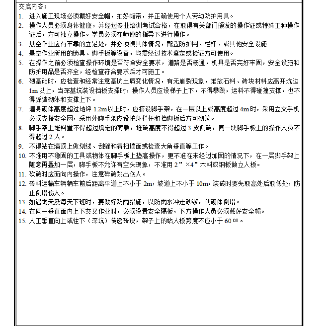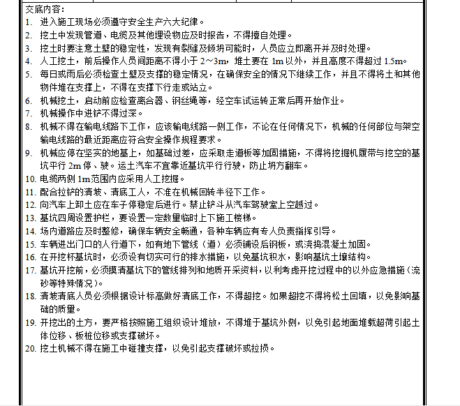 进入施工现场必须遵守安全生产六大纪律。装载机作业范围不得有人平土。打夯机工作前,应检查电源线是否有缺陷和漏电,机械运转是否正常,机械是否装置·开关保护,按“一机一开关”安装,机械不准带病运转,操作人员应带绝缘手套。基坑(槽)的支撑,应按回填的速度、施工组织设计要求及时依次拆除,即填土时应从深到浅分层进行,填好一层拆除一层,不能事先将支撑拆掉。