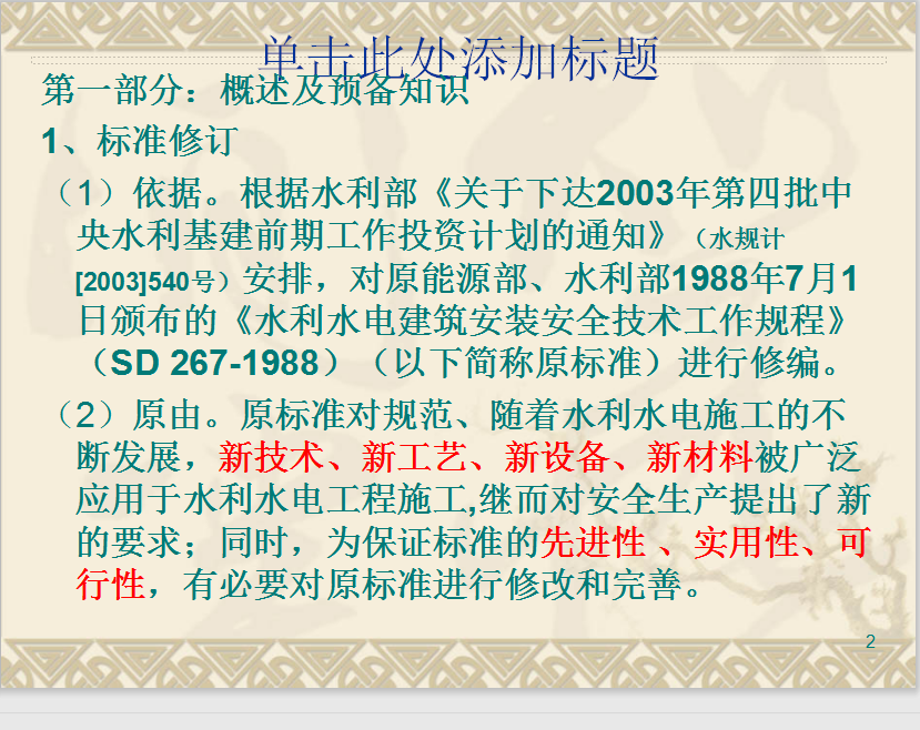 Ô­±ê×¼¶Ô¹æ·¶¡¢Ëæ×ÅË®ÀûË®µçÊ©¹¤µÄ²»¶Ï·¢Õ¹£¬Ð¼¼Êõ¡¢Ð¹¤ÒÕ¡¢ÐÂÉ豸¡¢Ð²ÄÁϱ»¹ã·ºÓ¦ÓÃÓÚË®ÀûË®µç¹¤³ÌÊ©¹¤,¼Ì¶ø¶Ô°²È«Éú²úÌá³öÁËеÄÒªÇó£»Í¬Ê±£¬Îª±£Ö¤±ê×¼µÄÏȽøÐÔ ¡¢ÊµÓÃÐÔ¡¢¿ÉÐÐÐÔ£¬ÓбØÒª¶ÔÔ­±ê×¼½øÐÐÐ޸ĺÍÍêÉÆ¡£
