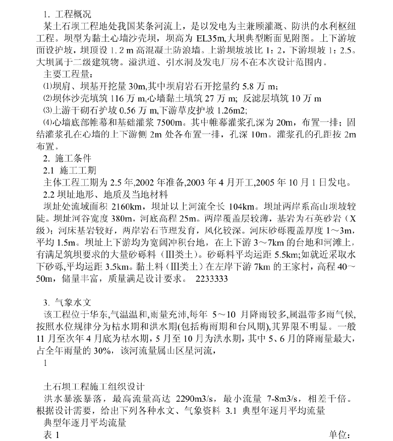 某土石坝工程地处我国某条河流上,是以发电为主兼顾灌溉、防洪的水利枢纽工程。坝型为黏土心墙沙壳坝,坝高为EL35m,大坝典型断面见附图。上下游坡面设护坡,坝项设1.2 m高混凝土防浪墙。上游坝坡坡比1: 2,下游坝坡1: 2.5。大坝属于二级建筑物。溢洪道、引水洞及发电厂房不在本次设计范围内。