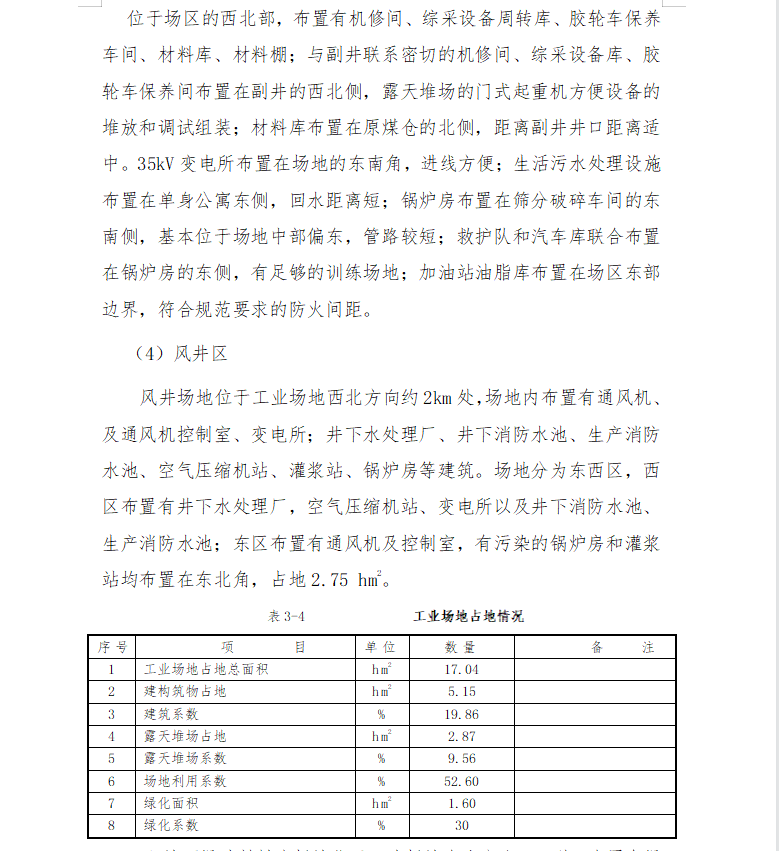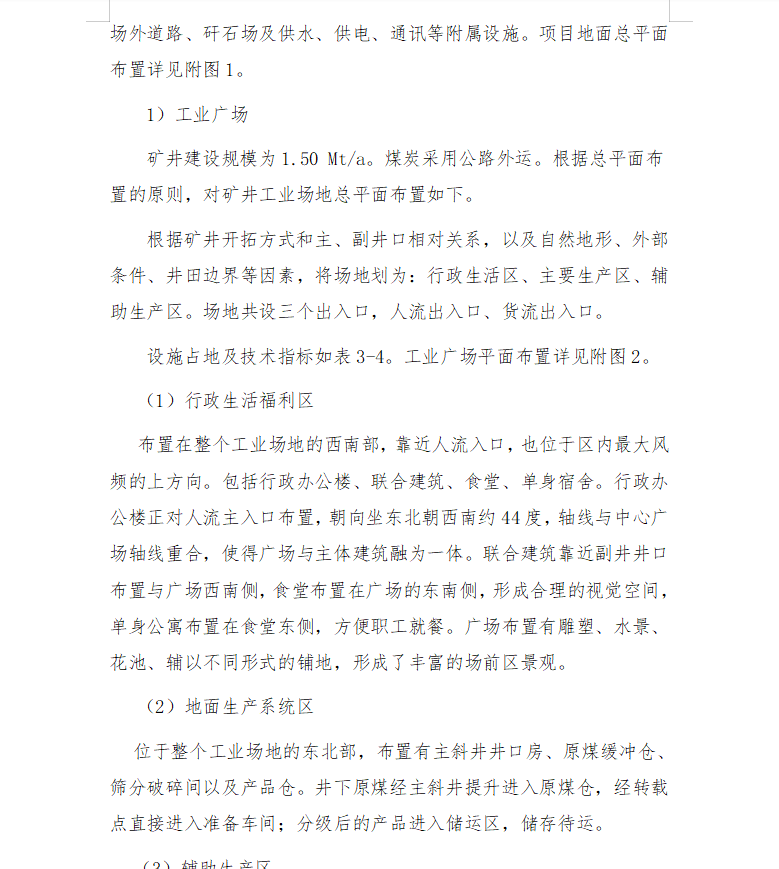 矿井建设规模为1.50 Mt/a。煤炭采用公路外运。根据总平面布置的原则,对矿井工业场地总平面布置如下。根据矿井开拓方式和主、副井口相对关系,以及自然地形、外部条件、井田边界等因素,将场地划为:行政生活区、主要生产区、辅助生产区。场地共设三个出入口,人流出入口、货流出入口。