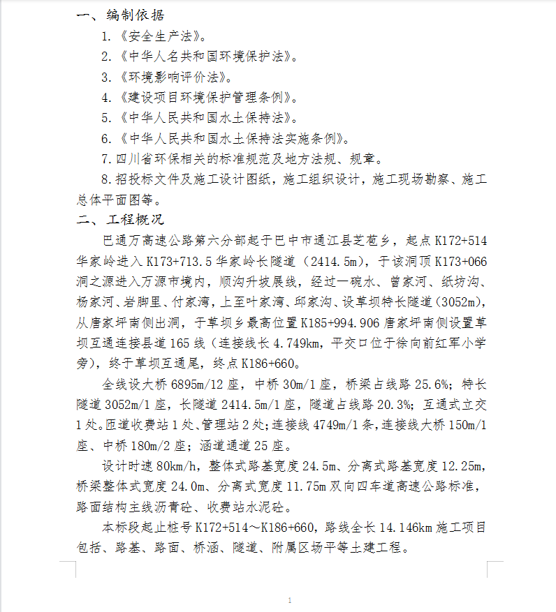 本标段起止桩号K172+514~K186+660,路线全长14.146km施工项目包括、路基、路面、桥涵、隧道、附属区场平等土建工程。