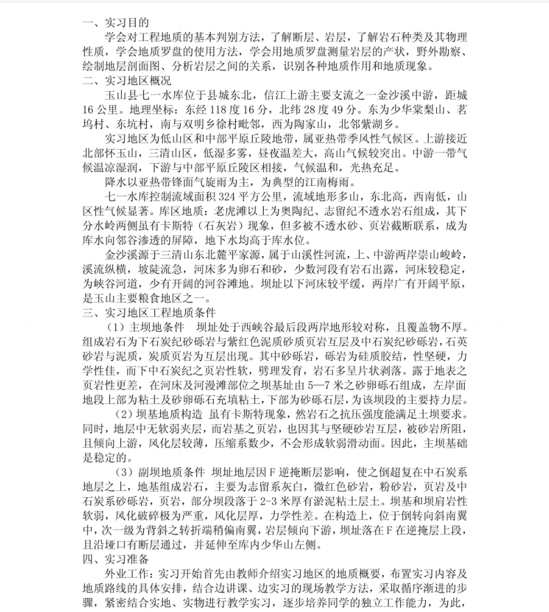 学会对工程地质的基本判别方法,了解断层、岩层,了解岩石种类及其物理性质,学会地质罗盘的使用方法,学会用地质罗盘测量岩层的产状,野外勘察、绘制地层剖面图、分析岩层之间的关系,识别各种地质作用和地质现象。