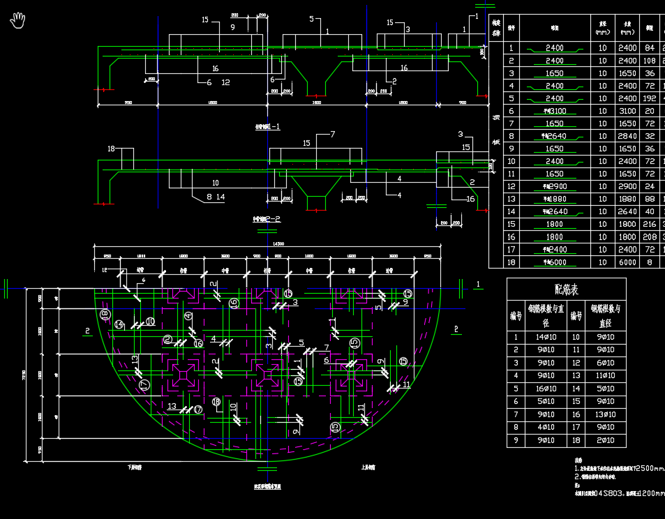 500立方圆形蓄水池设计详图包括剖面图、平面图、500立方圆形蓄水池顶板配筋图、500立方圆形蓄水池底板配筋图、500立方圆形蓄水池池壁及支柱配筋图