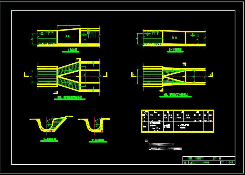 U形渠道断面与梯形、矩形断面连接形式设计图包括Ⅰ-Ⅰ剖视图,Ⅱ-Ⅱ剖视图,U形、梯形断面连接形式,Ⅲ-Ⅲ剖视图,Ⅳ-Ⅳ剖视图等