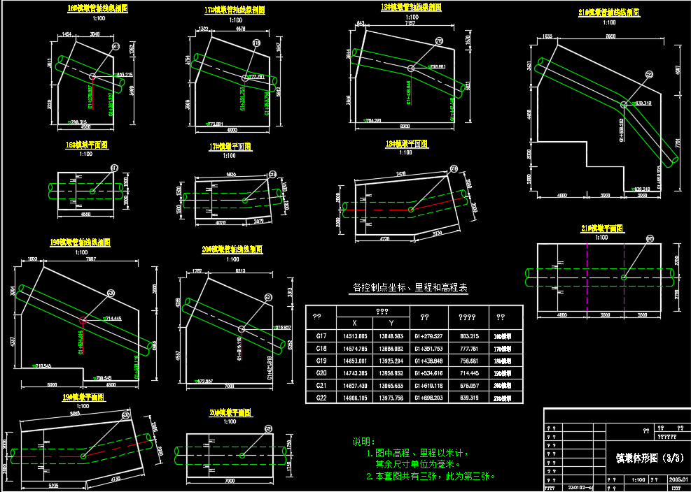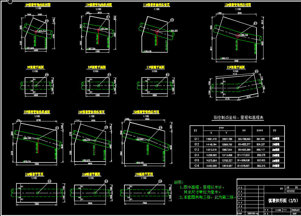 补充说明:本套图纸主要是设计了某处的灌区中的倒虹管镇墩配筋图纸,总共有12张图纸,其中主要是包括了镇墩体形图,各个镇墩配筋图,对配筋以及管轴线的镇墩介绍的很详细,镇墩基本上采用的是梯形的结构,采用的材质是钢管,总共有20个镇墩,对镇墩的各个不同的参数都是标注比较详细的,钢筋采用Ⅱ级钢筋,锚固长度40d,砼标号为C15,保护层厚50mm,间距为600mmx600mm,梅花型布置,有相应的钢筋表,希望大家下载本图纸。