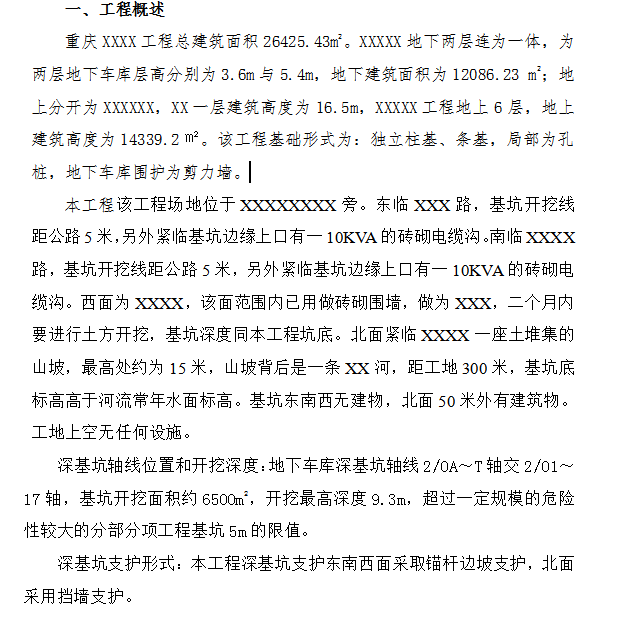 重庆XXXX工程总建筑面积26425.43m2。XXXXX地下两层连为一体,为两层地下车库层高分别为3.6m与5.4m,地下建筑面积为12086.23 m2;地上分开为XXXXXX,XX一层建筑高度为16.5m,XXXXX工程地上6层,地上建筑高度为14339.2㎡。该工程基础形式为:独立柱基、条基,局部为孔桩,地下车库围护为剪力墙。