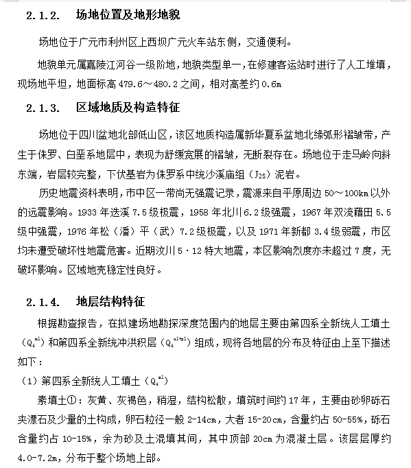 根据建设单位提供的资料,本工程±0标高为480.05m,现状地形标高479.6~480.2m,本次支护设计按标高480.05m设计,基坑开挖及支护前按设计高程场平后(即标高480.05m)开始施作。本工程基坑开挖深度-8.0m。基坑侧壁安全等级为一级,重要性系数为1.1。整个基坑支护面积7851平方米,支护周长348.6m。