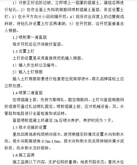 基坑按土方施工方案要求分层分段开挖,在完成上一层面土钉(每层高度控制在≤3.0米)与喷射混凝土面层强度达到设计强度70%以前,不得进行下一层土层开挖。(回填边坡直接进入土钉支护)为防止基坑边坡的裸露土体塌陷,对于易塌的土体可采取下列措施: