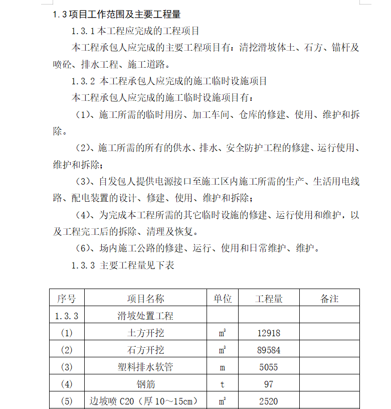 水库左坝肩上坝公路边坡滑坡处理工程是一项对滑坡体清挖,并进行喷锚支护的工程,本工程范围包括:坡顶及马道排水沟、滑坡体清挖、锚固与支护、施工道路、临时工程等建筑物。