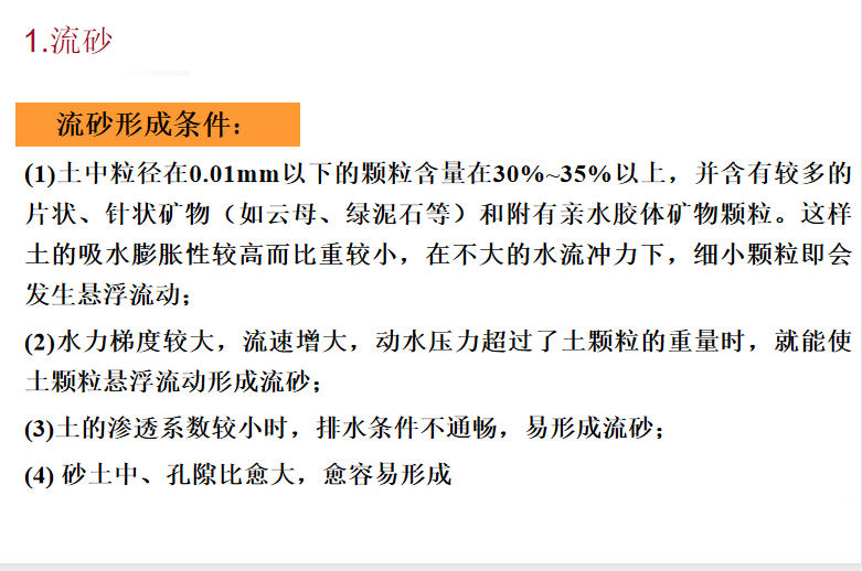 地下水在基坑工程实施过程中危害按成因可分为流砂、管涌和基坑底隆起,而且主要发生在细颗粒(尤其是粉质粘土、粉土、粉砂等)饱和含水的土层中。