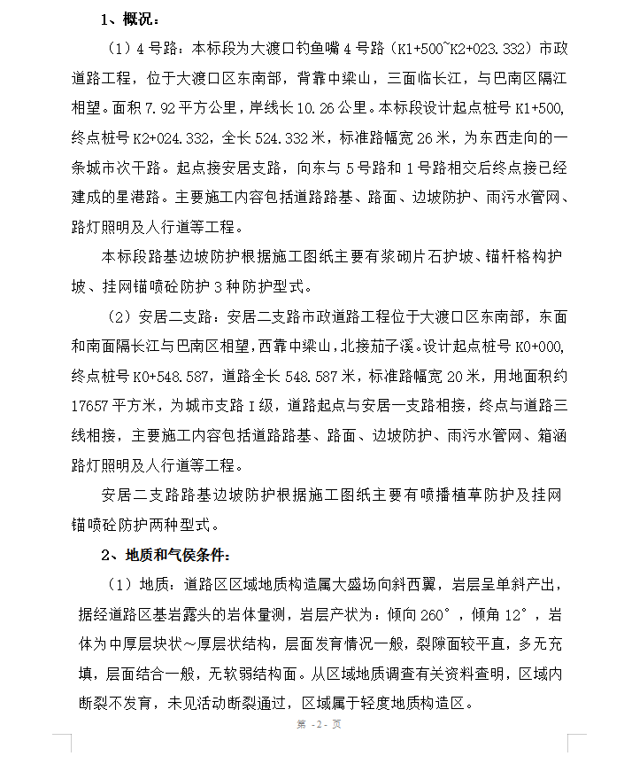 安居二支路市政道路工程位于大渡口区东南部,东面和南面隔长江与巴南区相望,西靠中梁山,北接茄子溪。设计起点桩号K0+000,终点桩号K0+548.587,道路全长548.587米,标准路幅宽20米,用地面积约17657平方米,为城市支路I级,道路起点与安居一支路相接,终点与道路三线相接,主要施工内容包括道路路基、路面、边坡防护、雨污水管网、箱涵路灯照明及人行道等工程。