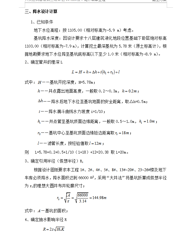 根据本工程的地质水文条件、基坑特征及本地施工经验等,结合本工程实际情况确定采用大口径水泥管井,整体连续抽水的方法,以疏干基坑地下水,降低水位,为基础施工创造条件。