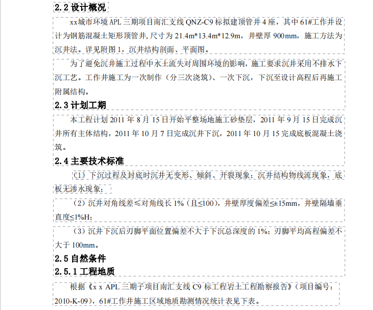 xx城市环境APL三期项目南汇支线QNZ-C9标拟建顶管井4座,其中61#工作井设计为钢筋混凝土矩形顶管井,尺寸为21.4m*13.4m*12.9m,井壁厚900mm,施工方法为沉井法。详见附图1,沉井结构剖面、平面图。为了避免沉井施工过程中水土流失对周围环境的影响,施工要求沉井采用不排水下沉工艺。工作井施工为一次制作(分三次浇筑)、一次下沉,下沉至设计高程后再施工附属结构。