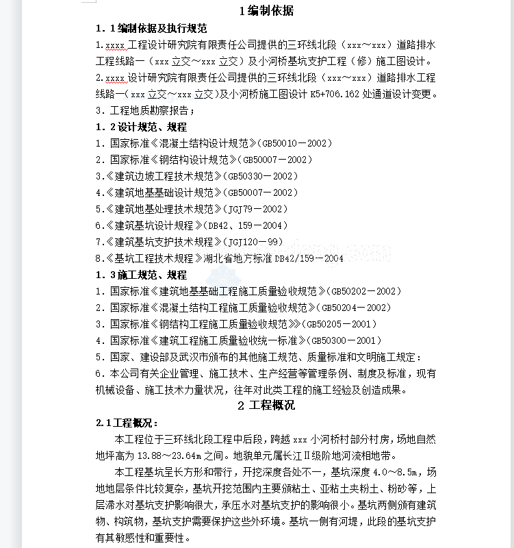 本工程位于三环线北段工程中后段,跨越xxx小河桥村部分村房,场地自然地坪高为13.88~23.64m之间。地貌单元属长江Ⅱ级阶地河流相地带。本工程基坑呈长方形和带行,开挖深度各处不一,基坑深度4.0~8.5m,场地地层条件比较复杂,基坑开挖范围内主要颁粘土、亚粘土夹粉土、粉砂等,上层滞水对基坑支护影响很大,承压水对基坑支护的影响很小。基坑两侧颁有建筑物、构筑物,基坑支护需要保护这些外环境。基坑一侧有河堤,此段的基坑支护有其敏感性和重要性。