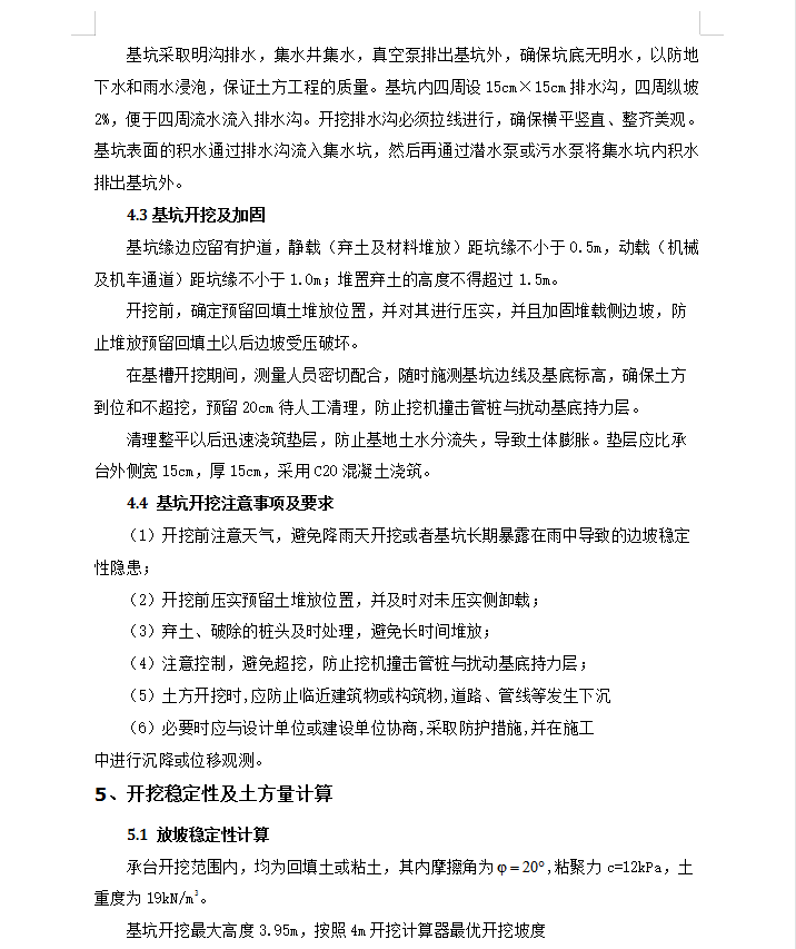 本线路墩柱承台埋深较浅,承台开挖范围内为回填土、粘土以及亚粘土。故采用放坡开挖,坡度为1:0.75,中部为承台,坑底每边加宽1.0m的工作面。受到地下水以及降雨天气的影响,应在基坑内设置排水明沟、集水坑。