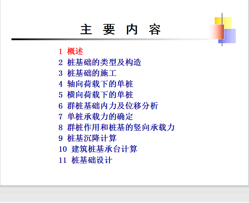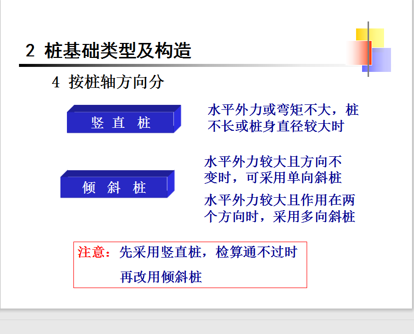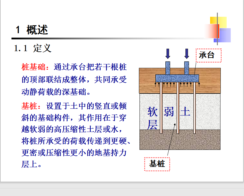 设置于土中的竖直或倾斜的基础构件,其作用在于穿越软弱的高压缩性土层或水,将桩所承受的荷载传递到更硬、更密或压缩性更小的地基持力层上。