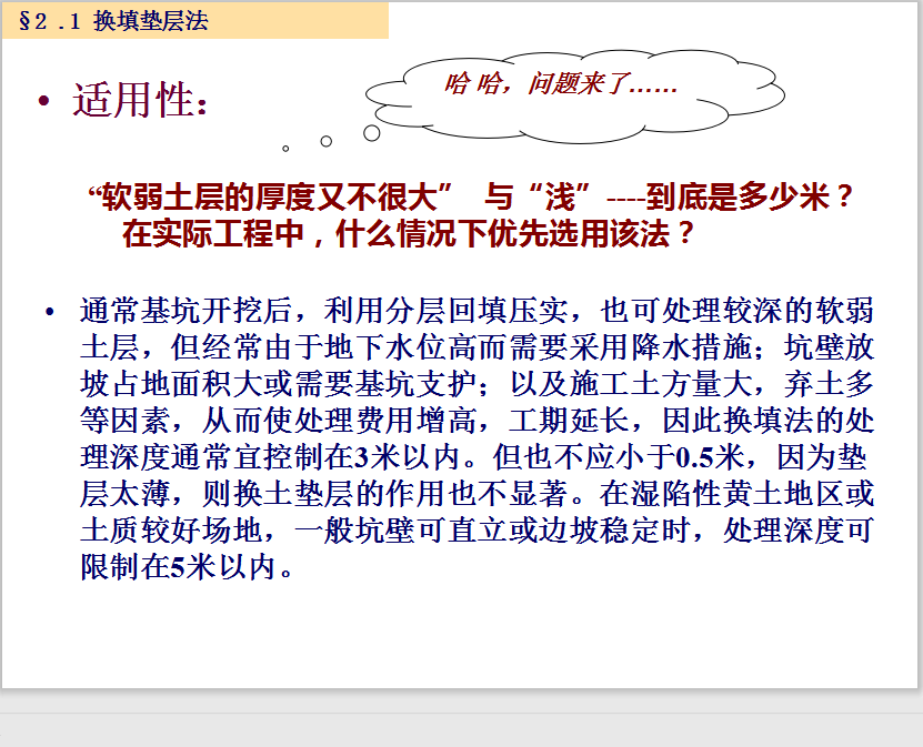 当软弱土地基的承载力和变形满足不了建筑物的要求,而软弱土层的厚度又不很大时,将基础底面下处理范围内的软弱土层部分或全部挖去,然后分层换填强度较大的砂、碎石、素土、灰土、二灰、粉煤灰、高炉干渣或其它性能稳定、无侵蚀性等材料,并压(夯、振)实至要求的密实度为止,这种地基处理方法称为换填法。