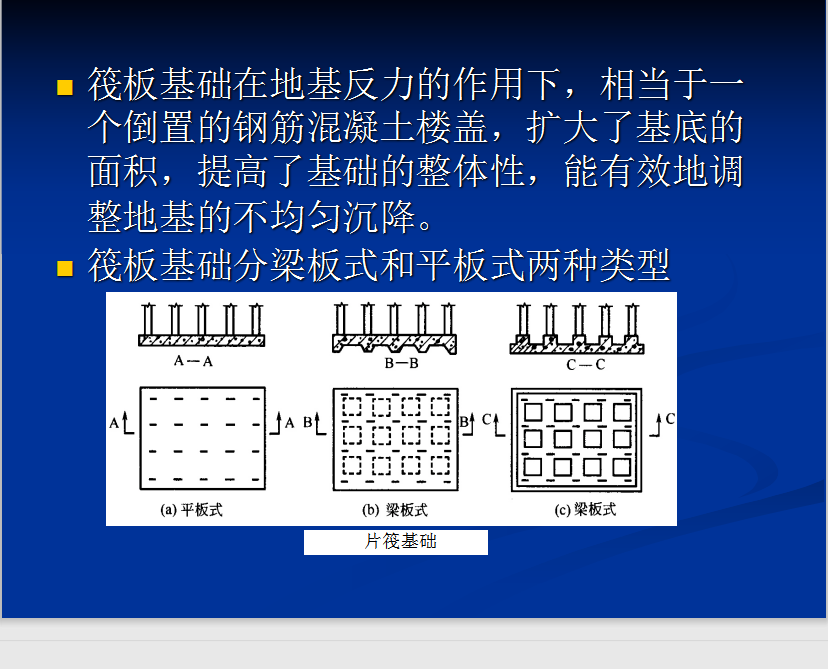 当上部结构荷载较大,而所在地的地基承载力又较软弱时,采用简单的条形基础或井格基础已不能适应地基变形的需要时,常将墙或柱下基础连成一片,使整个建筑物的荷载作用在一块整板上,这种基础称为筏板基础或片筏基础