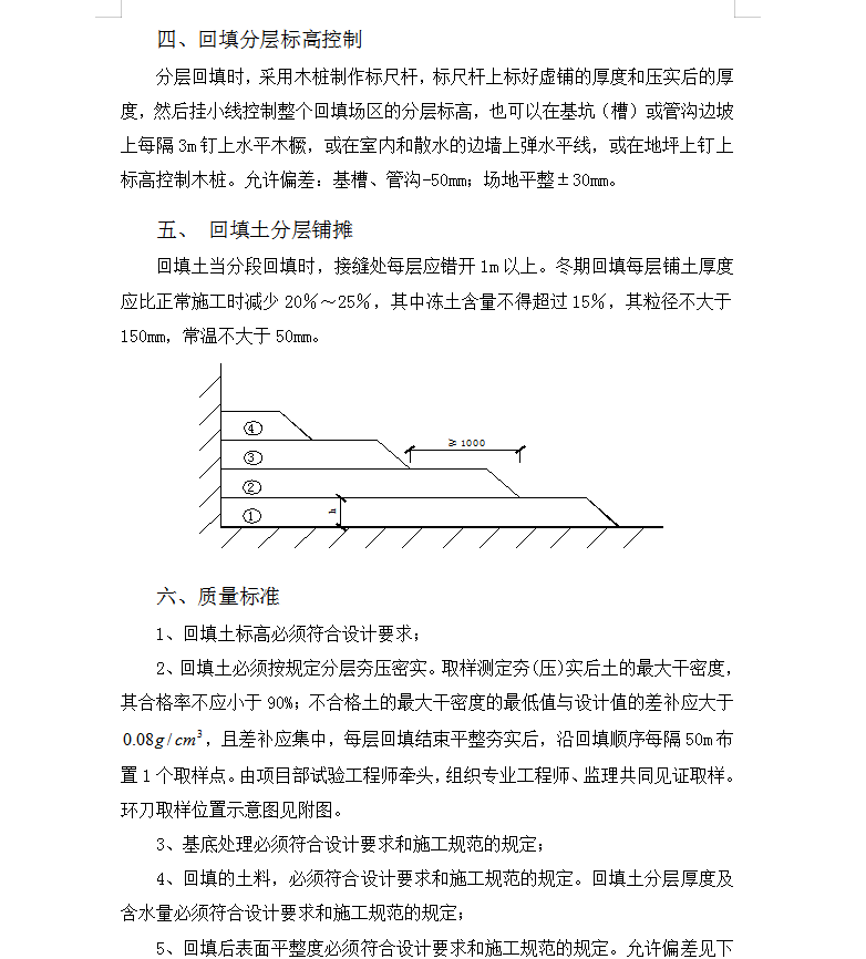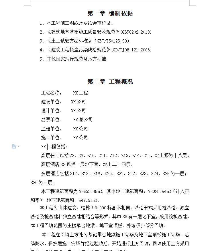 XX工程包括:高层住宅包括Z8、Z9、Z10、Z11、Z12、Z13、Z14、Z15,地上都为十八层。高层酒店S8包括一层地下室,地上二十四层。多层酒店包括S17、S18、S19、S20、S21、S22、S23、S24、S25为一层;S26为三层。本工程建筑面积为92633.45m2,其中地上建筑面积:92085.54m2(计入容积率);地下建筑面积:547.91m2。本工程为山体建筑,楼栋±0.000标高不相同,基础形式采用桩基础、独立基础及桩基础和独立基础相结合等形式。其中S8有一层地下室,采用筏板基础。本工程回填范围为主楼承台地梁、地下室顶板,外墙仅少部分回填。本工程在回填土方处为基础承台地梁施工完毕及地下室顶板施工完毕,后续防水、保护层施工完毕并经过验收后,开始进行土方回填,回填使用土方采用场地内运输至场内素土分层夯实回填至设计标高。