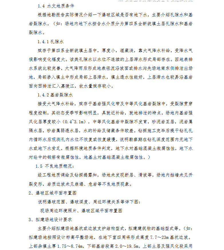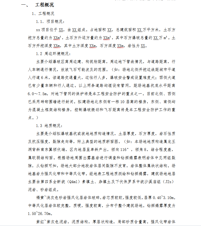 xx项目位于XX,由XX组成。占地面积XX,总建筑面积XX万平方米,土石方挖方总量约为XXm3,土石方外运方量约为XXm3,其中石方爆破总量约XX万m3。土石方开挖深度XXm,其中土方深度XXm,石方深度XXm,岩性为XX。主要介绍爆破区离周边建、构筑物距离,周边地下管线情况,与道路距离,行人车辆通行情况,放坡飞石可能波及的范围。(如:场地北侧开挖边线距城市干道人行道6米,该道路交通量大,过往行人多,爆破安全警戒设置难度大;西侧大道已有少量车辆和行人通过。以上两条道路均埋设有管网,距场地基坑底水平距离6.0~7.5m,对地下管网的保护将是本工程安全防护的重点之一,目前北侧、西侧已采用砖砌围墙进行封闭。拟建场地北东侧有一栋10层高的楼房,东侧、南侧均为混凝土框架结构楼房,控制爆破振动和飞石距离将是本工程安全防护工作的重点。)