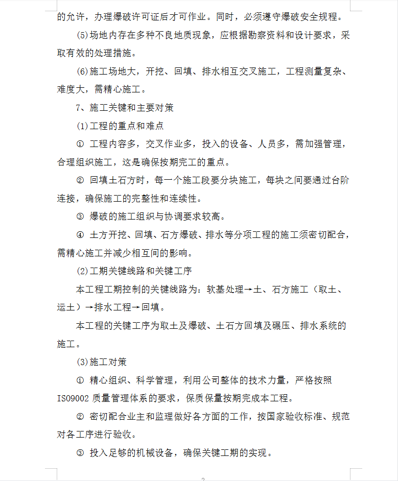 工程的主要特点:本工程场地宽阔,开挖、回填土石方量巨大,工期紧。另有A标段在同时施工,需要协调配合。场地内有沟塘、植物土、树根、建筑垃圾需要进行处理。本场地石方需自行爆破,爆破工作量大。爆破前需征得相关部门的允许,办理爆破许可证后才可作业。同时,必须遵守爆破安全规程。