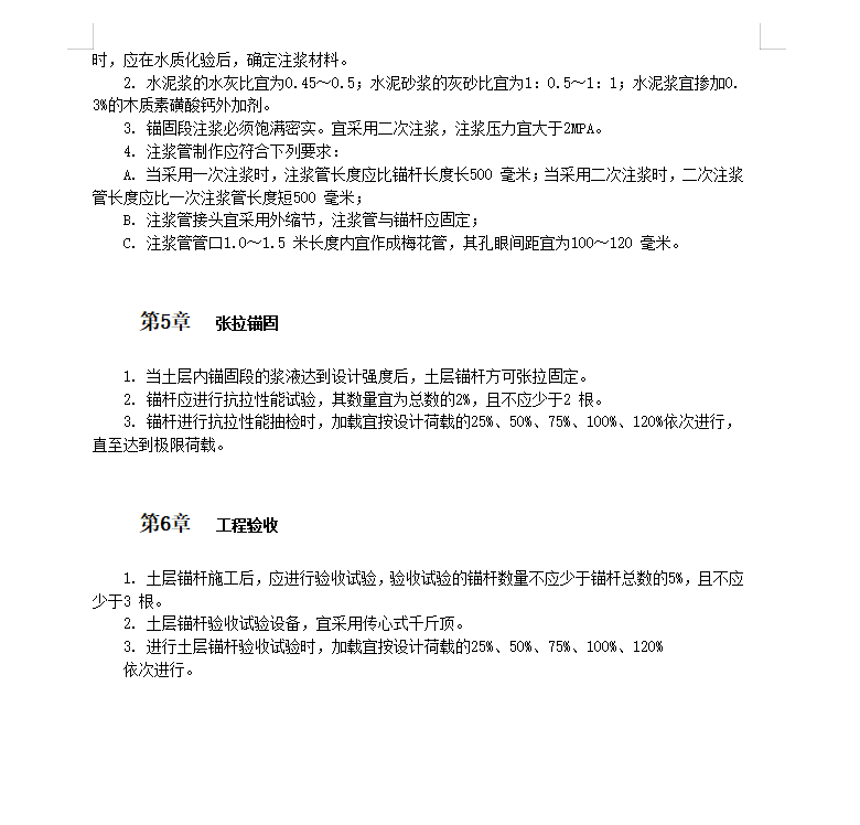 当基坑开挖不能放坡时,可采用土层锚杆支护。土层锚杆施工前,应确定基坑支护所承受的荷载、锚杆的布置、锚杆承载能力、锚杆稳定性、锚固段长度、直径和落杆直径等。
