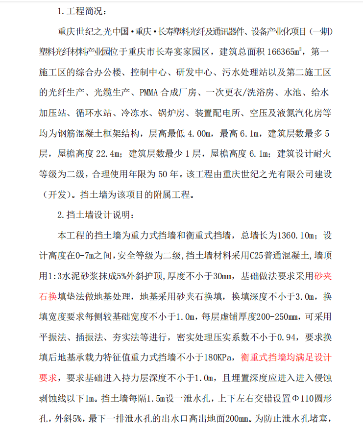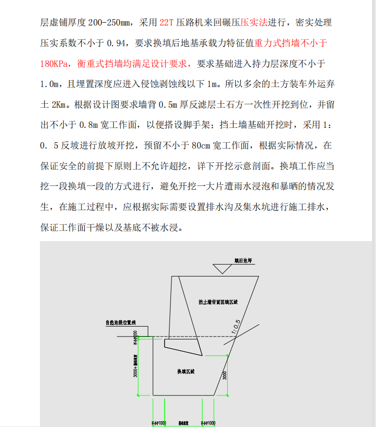 本基础做法设计要求采用换填垫法做地基处理,地基采用 3:7 砂夹石换填,换填深度不小于 3.0m,换填宽度要求每侧较基础宽度不小于 1.0m,每层虚铺厚度 200-250mm,本工程采用 22T 压路机来回碾压压实法进行,密实处理压实系数不小于 0.94,要求换填后地基承载力特征值重力式挡墙不小于 180KPa,衡重式挡墙均满足设计要求,要求基础进入持力层深度不小于 1.0m,且埋置深度应进入进士侵蚀剥蚀线以下 1m。换填工作应在监理工程师监督下进行施工。 砂夹石需要在场外运至现场,具体里程数和回填数量由现场签证确定。