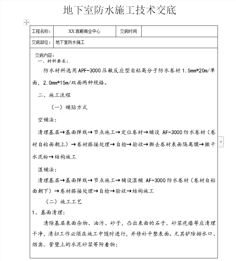 ÇåÀí»ù²ã¡ú»ùÃæµ¯Ïß¡ú½ÚµãÊ©¹¤¡ú¶¨Î»¾í²Ä¡úÆÌÉè AF-3000·ÀË®¾í²Ä£¨¾í²Ä×ÔÕ³Ãæ³¯ÉÏ£©¡ú¾í²Ä´î½Ó´¦Àí¡ú×Ô¼ì¡úÑéÊÕ¡ú˺ȥ¾í²Ä±íÃæ¸ôÀëĤ¡úÈö¸ÉË®Äà·Û¡ú½á¹¹Ê©¹¤