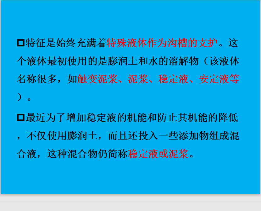 ÔÚµØÃæÉÏÓÃÒ»ÖÖÌØÊâµÄÍÚ²ÛÉ豸£¬ÑØ×ÅÉÍÚ¹¤³ÌµÄÖܱß(ÀýÈçµØÏ½ṹµÄ±ßǽ)£¬ÒÀ¿¿Äཬ(ÓÖ³ÆÎȶ¨Òº)»¤±ÚµÄÖ§»¤£¬¿ªÍÚÒ»¶¨²Û¶Î³¤¶ÈµÄ¹µ²Û£»ÔÙ½«¸Ö½îÁý·ÅÈë¹µ²ÛÄÚ¡£²ÉÓõ¼¹ÜÔÚ³äÂúÎȶ¨ÒºµÄ¹µ²ÛÖнøÐлìÄýÍÁ½½Öþ£¬½«Îȶ¨ÒºÖû»³öÀ´¡£Ï໥ÁڽӵIJ۶Σ¬ÓÉÌØ±ð½ÓÍ·£¨Ê©¹¤½ÓÍ·£©½øÐÐÁ¬½Ó¡£