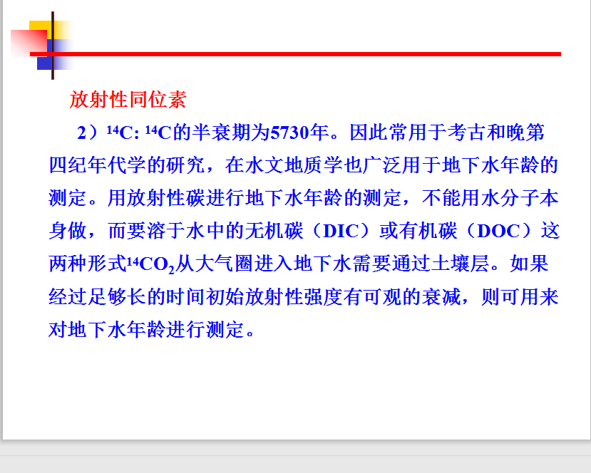 氚(3H)是一种半衰期的氢同位素。3H含量增高有两个因素产生,一是在平流层中宇宙射线作用于14N产生少量的氚;另外1952年后的20年间大气层中氢弹试验。无论是天然或人工产生的氚通过降水进入到水循环中。它在地下水中的存在提供了地下水的补给作用很有力证据。