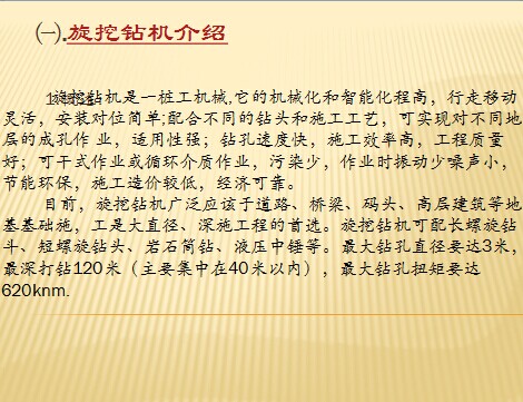 旋挖钻机是一桩工机械,它的机械化和智能化程高,行走移动灵活,安装对位简单;配合不同的钻头和施工工艺,可实现对不同地层的成孔作 业,适用性强;钻孔速度快,施工效率高,工程质量好;可干式作业或循环介质作业,污染少,作业时振动少噪声小,节能环保,施工造价较低,经济可靠。