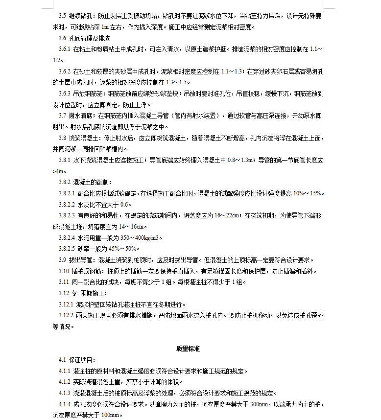 本工艺标准适用于工业与民用建筑中地下水位高的软、硬土层泥浆护壁成孔灌注桩工程。钻孔机就位→钻孔→ 注泥浆→下套管→继续钻孔→排渣→清孔→吊放钢筋笼→射水清底→插入混凝土导管→浇筑混凝土→拔出导管 →插桩顶钢筋。 钻孔机就位:钻孔机就位时,必须保持平稳,不发生倾斜、位移,为准确控制钻孔深度,应在机架上或机管上作出控制的标尺,以便在施工中进行观测、记录。