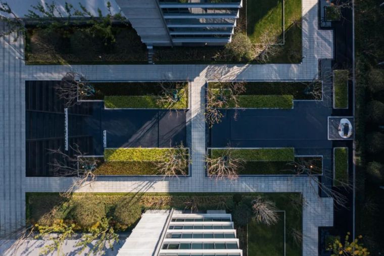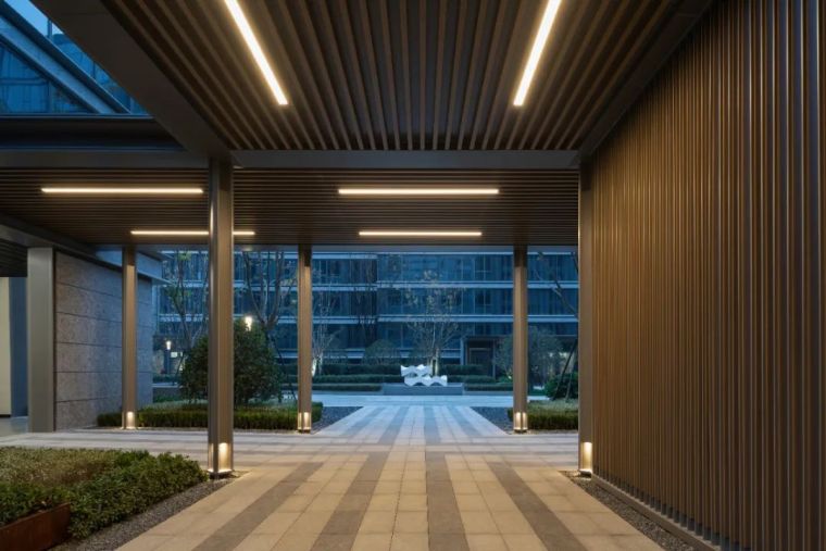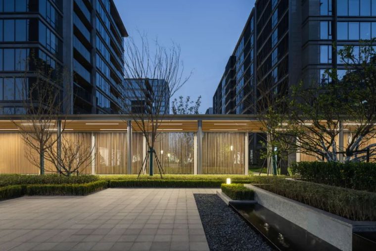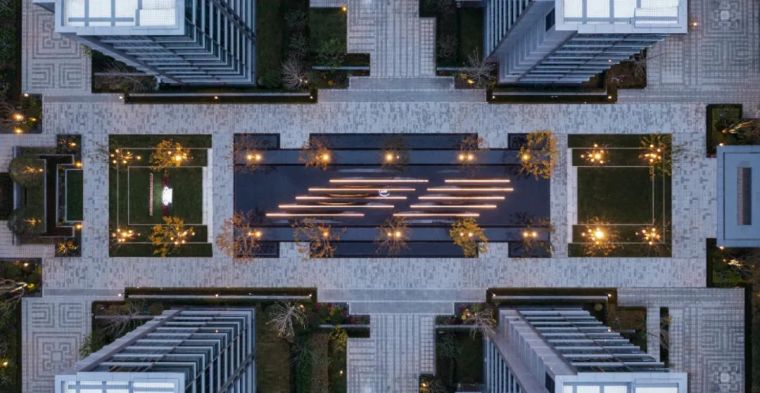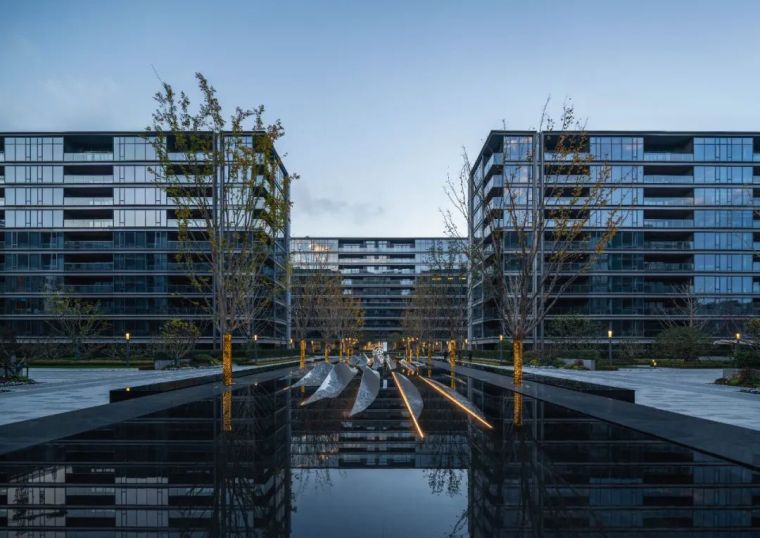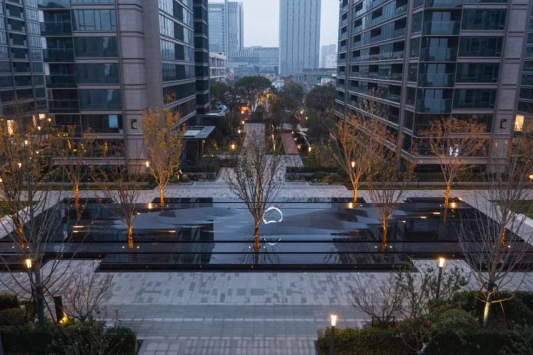 品质的传达往往体现在细节的雕琢,而细节往往是最容易被忽视却又极其重要的环节。在这次凤起潮鸣的打造过程中,大到空间尺度,小至台阶导水槽,处处都展现了我们对一个城市,对宁波人的诚意。所到之处都在讲述着一段对“山茶花”的联想。住宅区中消防扑救面及人行动线铺装在整个空间中占有很大比例,我们在铺装整体设计中,考虑既要弱化大面硬质对空间感受的冲击,又要体现艺术化的演绎,因此我们决定延续景观线性的表达,铺装整体构图灵感来自荷兰画家蒙德里安的几何抽象画作,简洁的线条产生线性的引导,深浅交错的线条在视觉上弱化了大尺度的空间感觉,抽象的山茶花印落在每一个消防扑救场地,呈现出一幅艺术化的作品。 园区中两大核心组团都以水景的形式拉开序幕。穿过北侧大堂门庭的书香,印入眼帘的是对称层层抬升的欢迎水景,两侧是枝干婀娜的丛⽣乌桕列植迎礼,季相分明。随着视线的推移,末端和水光一起浮动的是以“山茶花”造型抽象演变而来的艺术雕塑,镜面的质感与水体相得益彰,香槟色的飘带更是增加了一抹灵气。