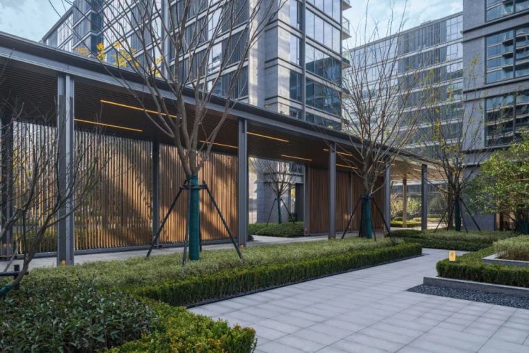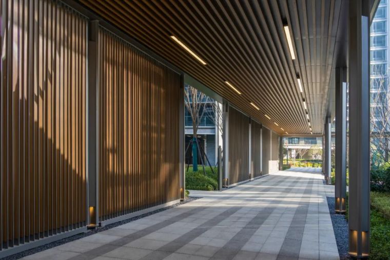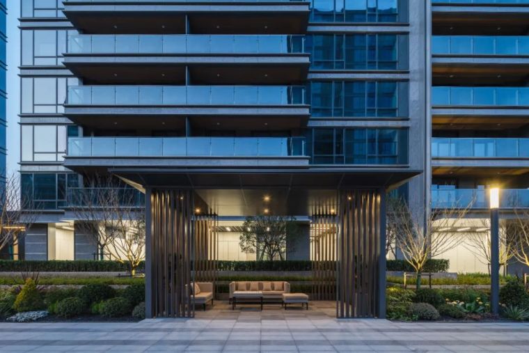 关于凝聚社区意识,我们在架空层做了进一步的努力,架空层我们强调对服务功能的多样性以及与室外景观空间之间的互动,我们提出一个social hub的理念,让架空层成为一个社区交流的核心,利用架空层的独特特性来聚合鼓励社区的交流,鼓励人与人之间的互动。在西方现代的项目开发中我们常常可以看到,这种混合开发提供高效便利的生活空间是非常受到人们欢迎的,因为这种多功能的混合开发即满足了生活上的便利以及效率,对于城市的核心区域来说也绝对是必要并且正向的。对于整个凤起潮鸣项目来说,她对宁波新城核心区域来说一定是开放的,她是以一个 “welcome”的姿态来面对这个城市,但同时间,在住宅围合内向的大区环境中,她又极大的展现出一种隐于城市中极度静溢的反差。这个反差首先是由景观来塑造的,我们住宅大区的内部的成熟乔木成数非常多,大量的绿化为空间的自然感受以及静溢提供了一个非常的基础,再加上设计的语汇采用去风格化的现代极简手法,让空间的永恒感以及自然感受来进一步提升住宅空间的静溢感受。