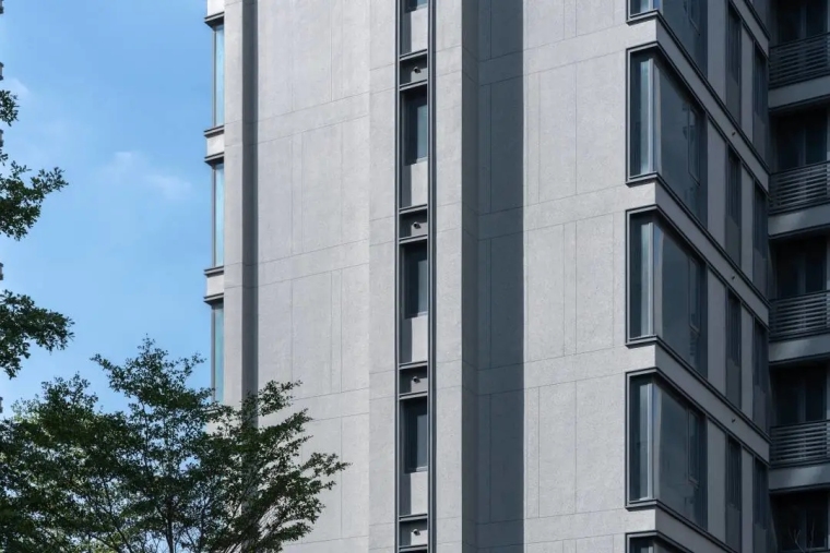 在立面设计中,“背”立面的设计往往因平面功能性和成本控制而制约,而中茵 · 玖珑台将“背”立面同样作为主立面来反复推敲设计,从东方传统艺术中汲取灵感,提炼格栅元素,将其固化在外立面通过平面和功能的整体协调,精细化处理楼梯间和设备平台等功能元素,以东方的设计语素诠释经典,表达出空间的哲学意境,匠造高端精品。建筑色彩以冷灰色为基调,采用“少即是多”的概念表达出建筑的宁静感,以LOW-E中空玻璃搭配深灰色铝板,通过丰富的细节来呈现建筑的美感,塑造出建筑回归现代主义的本源,删繁就简,回归宁静雅致的东方格调中。设计过程中,方案团队与施工图、幕墙设计团队多次沟通,在成本可控的条件下,对细节完成和分缝控制多次推敲,以两个不同模数,进行了错缝划分,竖向拼接,强化垂直感。