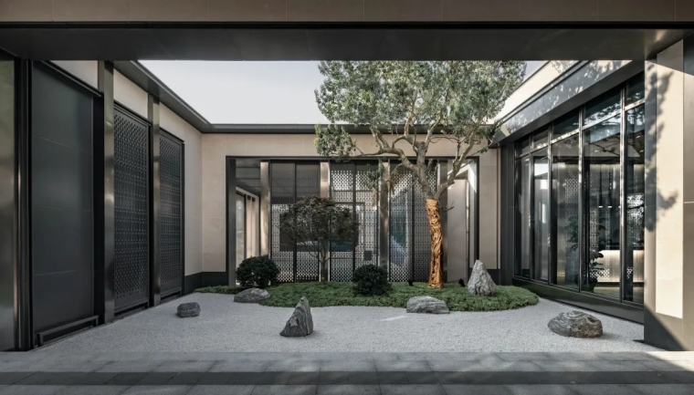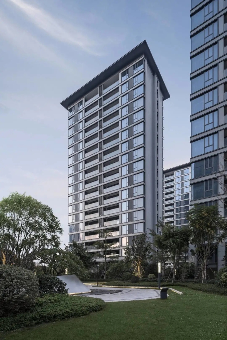 在某种意义上,场所是一个人记忆的一种物体化和空间化,也就是城市学家阐述的“sense of place”,即对一个地方的认同感和归属感。以极简的设计策略回应场地的文脉,寻求建筑的归属感,是此次设计的出发点。“出则致远,入则归心”。中茵 · 玖珑台以新中式的建筑设计理念,糅合了中国传承千年归家礼序,植入中式园林的元素,加以新式现代精髓表达,让现代门庭充满传统的仪式感。社区入口恣意挥写古意,描摹出文人雅士的书画意境,在悠久而现代、传统又蕴含活力的城市中,用新中式的典雅回归文脉,诠释最新的品读鉴赏,书写新时代的传承与探索,实现一场人文回归之旅。立面设计上强调横向的线条,去除多余的装饰线条,化繁为简,打造干净利落的形体和线条,保证了采光和景观最大化的功能需求。同时建筑的玻璃立面完美的和城市界面相结合,创造出通透而有力的建筑形象。