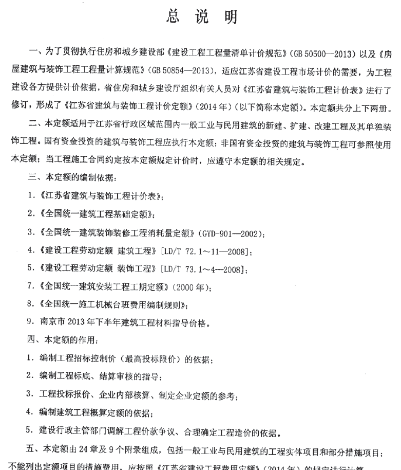 本定额适用于江苏省行政区域范围内一般工业与民用建筑的新建、扩建、改建工程及其单独装饰工程。国有资金投资的建筑与装饰工程应执行本定额;非国有资金投资的建筑与装饰工程可参照使用本定额:当工程施工合同约定按木定额规定计价时,应遵守本定额的相关规定。