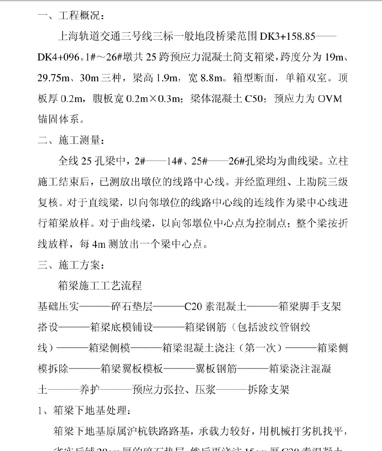 轨道交通三号线三标一般地段桥梁范围DK3+158.85——DK4+096。1#~26#墩共25跨预应力混凝土简支箱梁,跨度分为19m、29.75m、30m三种,梁高1.9m,宽8.8m。箱型断面,单箱双室。顶板厚0.2m,腹板宽0.2m×0.3m;梁体混凝土C50;预应力为OVM锚固体系。