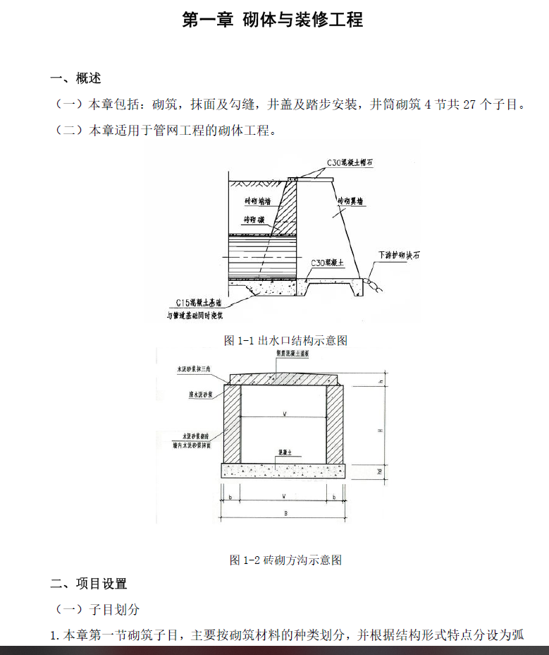 本章包括:砌筑,抹面及勾缝,井盖及踏步安装,井筒砌筑4节共27个子目。本章第一节砌筑子目, 主要按砌筑材料的种类划分,并根据结构形式特点分设为弧(圆)形、直形子目,适合多种结构施工方法。其中:混凝土模块砌筑按常用的30和40两种型号,分标准块、直角块、折角块三种类型设置子目。硅砂砌块砌筑又分为硅砂砌块井体砌筑、硅砂一体井砖井体砌筑、砂基透气防渗毯三中类型。