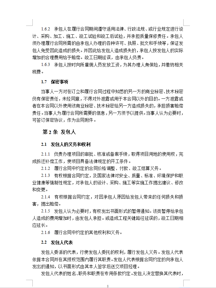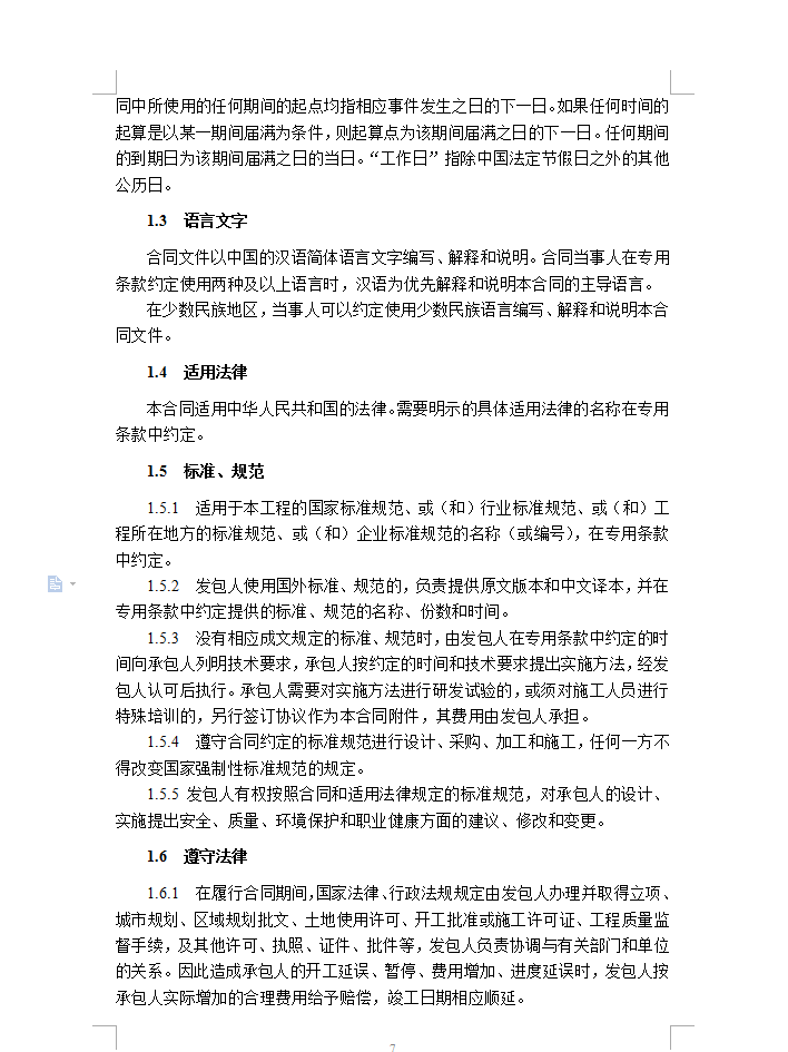 标准、规范:1 适用于本工程的国家标准规范、或(和)行业标准规范、或(和)工程所在地方的标准规范、或(和)企业标准规范的名称(或编号),在专用条款中约定。2 发包人使用国外标准、规范的,负责提供原文版本和中文译本,并在专用条款中约定提供的标准、规范的名称、份数和时间。3 没有相应成文规定的标准、规范时,由发包人在专用条款中约定的时间向承包人列明技术要求,承包人按约定的时间和技术要求提出实施方法,经发包人认可后执行。承包人需要对实施方法进行研发试验的,或须对施工人员进行特殊培训的,另行签订协议作为本合同附件,其费用由发包人承担。4 遵守合同约定的标准规范进行设计、采购、加工和施工,任何一方不得改变国家强制性标准规范的规定。5 发包人有权按照合同和适用法律规定的标准规范,对承包人的设计、实施提出安全、质量、环境保护和职业健康方面的建议、修改和变更。