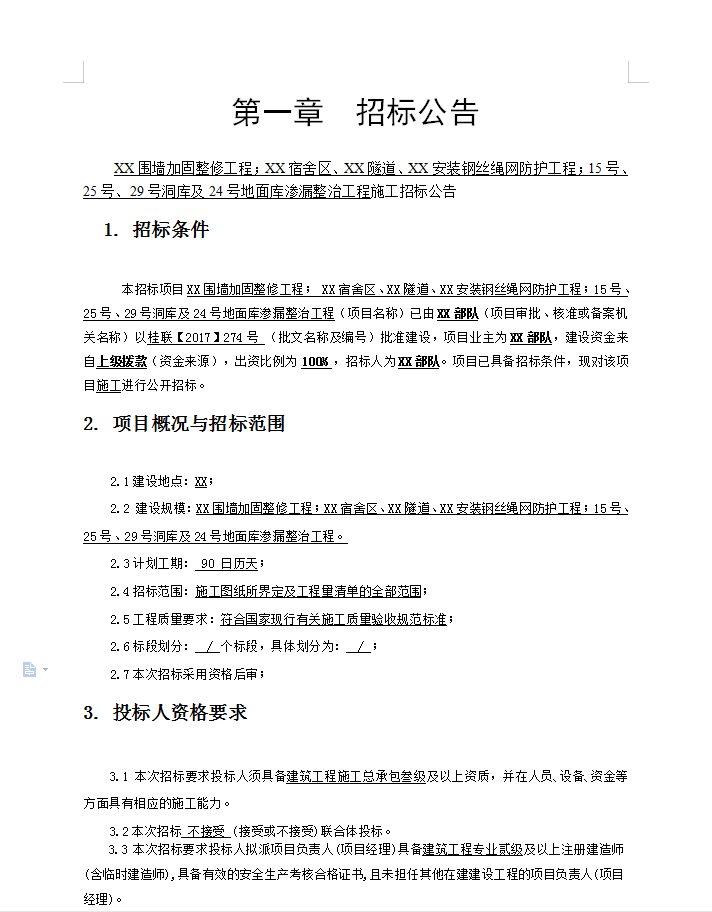 建设规模:XX围墙加固整修工程;XX宿舍区、XX隧道、XX安装钢丝绳网防护工程;15号、25号、29号洞库及24号地面库渗漏整治工程。