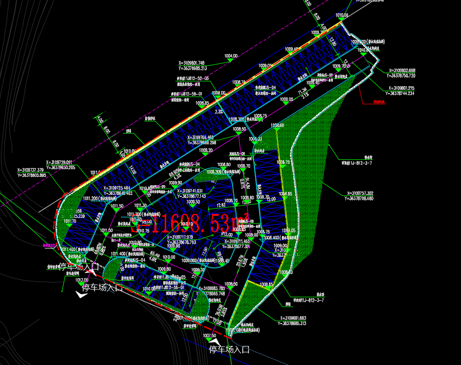 总用地面积29968㎡,其中硬质铺装(停车位及道路)用地面积26351.50㎡,绿化面积3596.48㎡,建筑占地面积为20.52㎡。