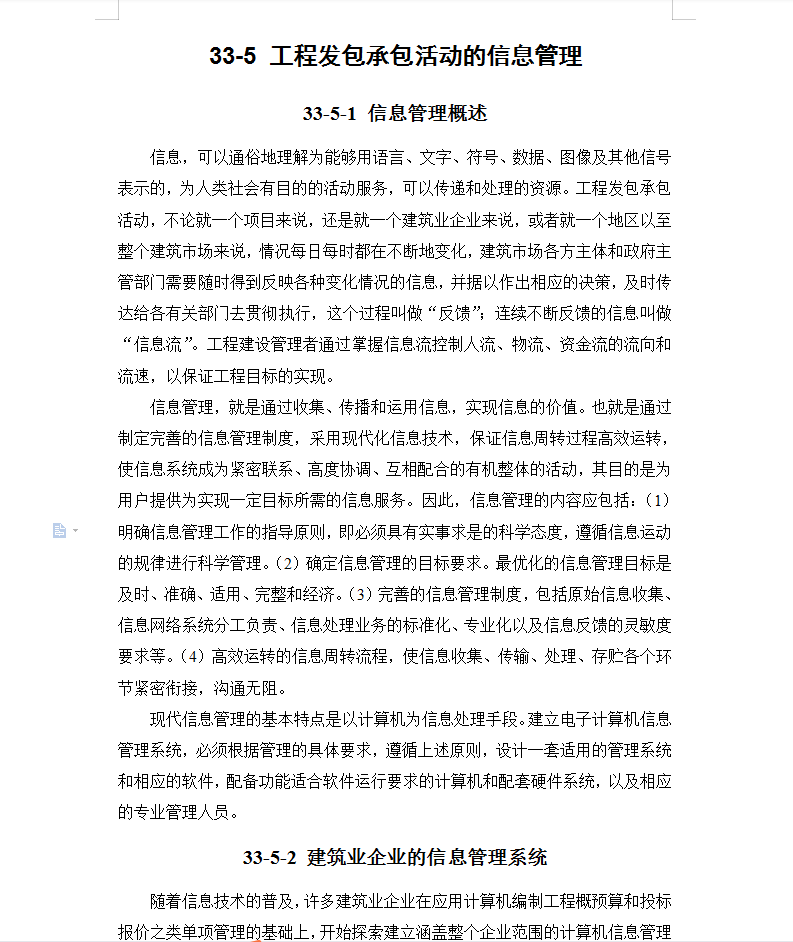 信息,可以通俗地理解为能够用语言、文字、符号、数据、图像及其他信号表示的,为人类社会有目的的活动服务,可以传递和处理的资源。工程发包承包活动,不论就一个项目来说,还是就一个建筑业企业来说,或者就一个地区以至整个建筑市场来说,情况每日每时都在不断地变化,建筑市场各方主体和政府主管部门需要随时得到反映各种变化情况的信息,并据以作出相应的决策,及时传达给各有关部门去贯彻执行,这个过程叫做“反馈”;连续不断反馈的信息叫做“信息流”。工程建设管理者通过掌握信息流控制人流、物流、资金流的流向和流速,以保证工程目标的实现。