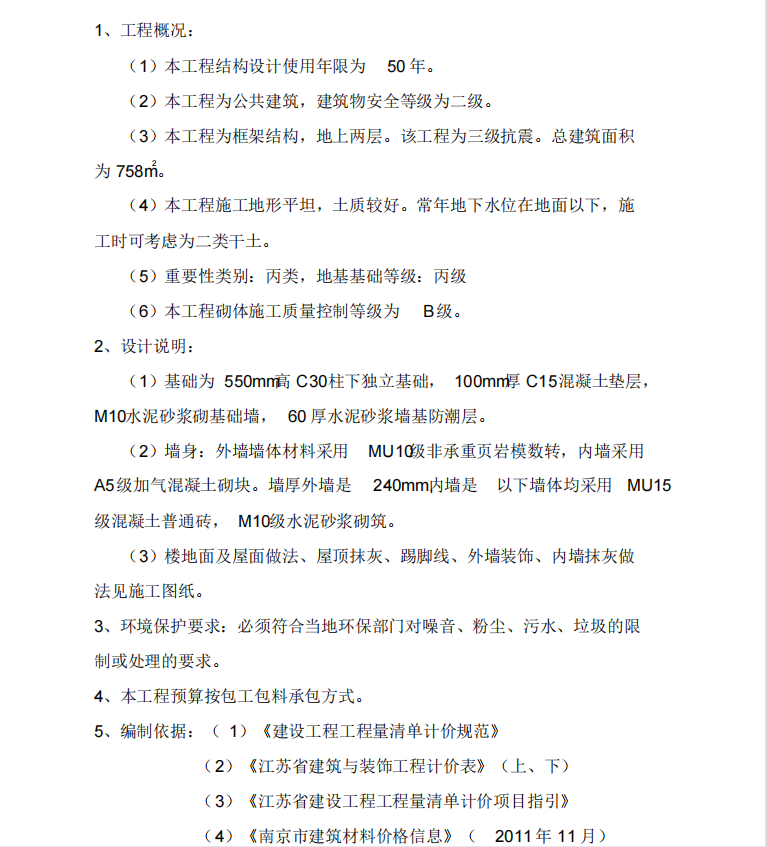 本工程结构设计使用年限为 50年。本工程为公共建筑,建筑物安全等级为二级。本工程为框架结构,地上两层。该工程为三级抗震。总建筑面积为758m。本工程施工地形平坦,土质较好。常年地下水位在地面以下,施工时可考虑为二类千土。重要性类别:丙类,地基基础等级:丙级本工程砌体施工质量控制等级为B级。