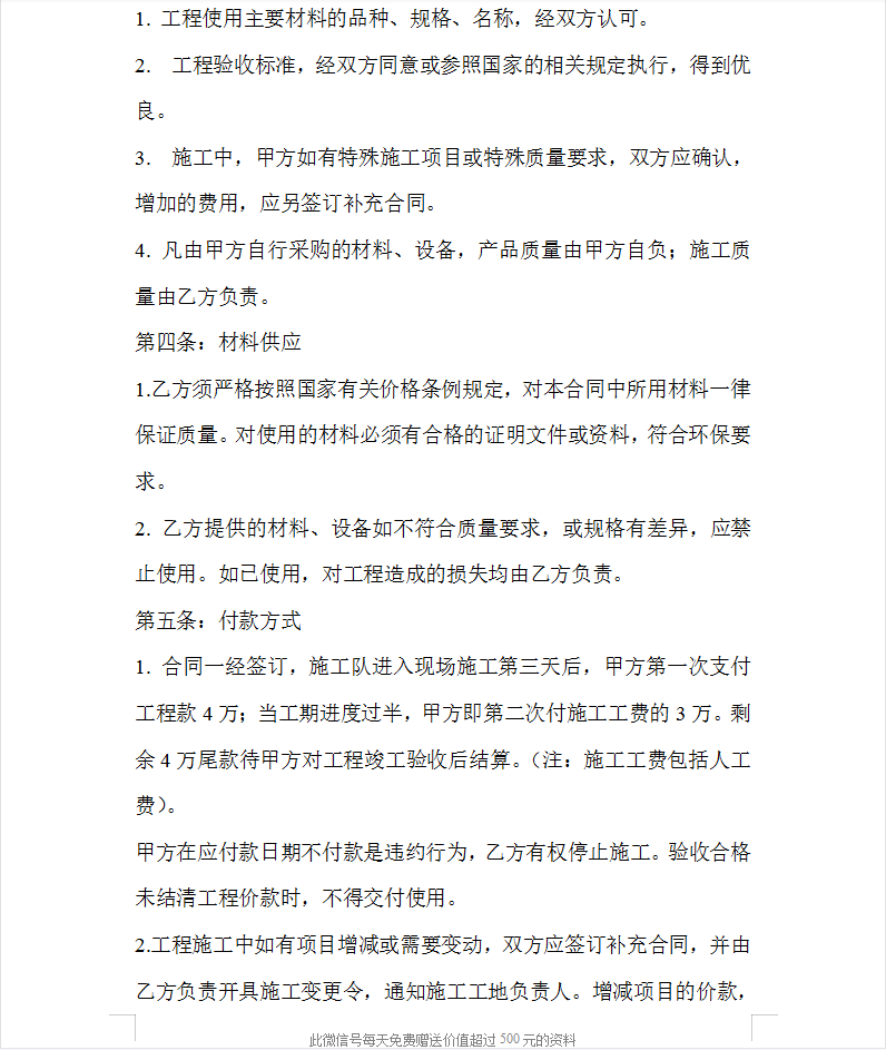 由甲方自行挑选的材料、设备,因质量不合格而影响工程质量和工期,其返工费由甲方承担,由于乙方施工原因造成质量事故,其返工费用由乙方承担,工期不变。 在施工中,因工程质量问题、双方意见不一而造成停工,均不按误工或延迟工期论处,双方应主动要求有关部门调解或仲裁部门协调、处理,尽快解决纠纷,以继续施工。
