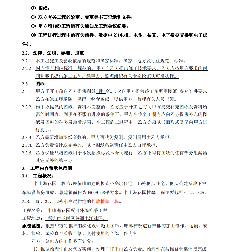 本工程为7座依山而建的板式小高层住宅、16栋低层住宅、低层公建及地下室车库设备房组成,总建筑面积为69009.68平方米。半山海花园帷幕工程主要包括:1#、2#A、2#B、2#C、3#、5#栋小高层住宅的外墙帷幕工程。